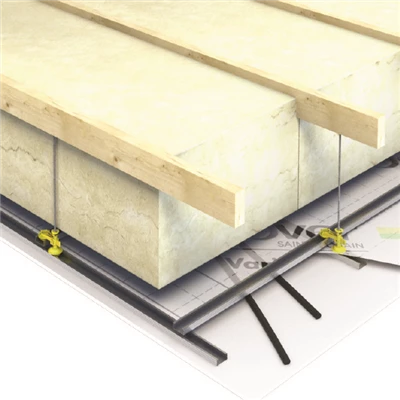 Le Cavalier Intégra2 de Isover est un accessoire en composite jaune destiné à permettre de descendre un plafond plat sur des hauteurs importantes.