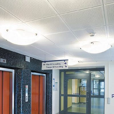 Dalles en plâtre perforées et contre-facées d’un voile en fibre végétale absorbante.