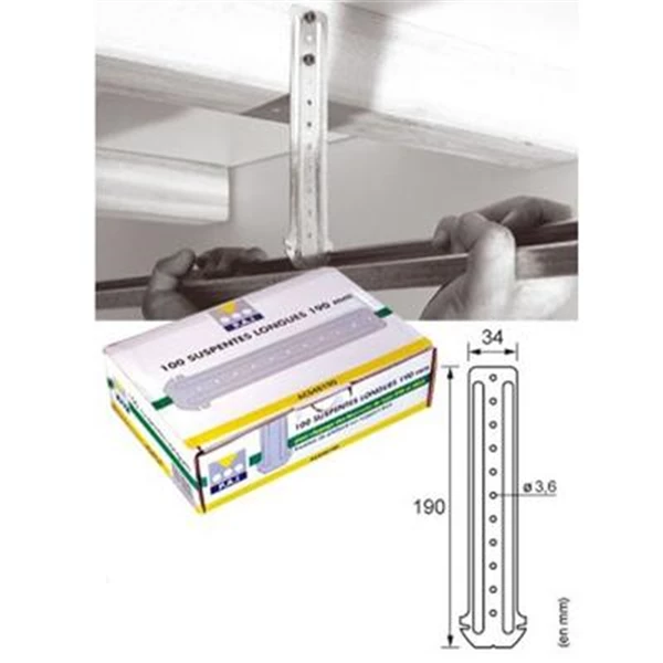 Suspente longue de 190 mm en acier galvanisé d’épaisseur 75/100. Accessoire de suspension par clipsage dans des fourrures de type 17-47 sous charpente bois pour plafonds en plaques de plâtre.