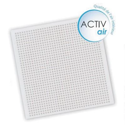 Dalle en plaque de plâtre peinte lisse et à perforations rondes et régulières, permettant la neutralisation des principaux composés organiques volatifs (COV).