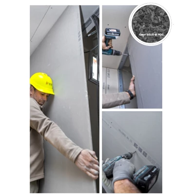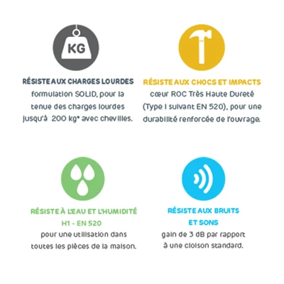 La plaque SOLIDROC résiste aux chocs et charges lourdes, avec une résistance au bruit supérieur à une plaque standard.