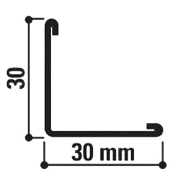 Cornière de rive en L de 30 mm, à bords repliés pour des applications industrielles. Les deux faces extérieures peuvent être utilisées indifféremment. Face large (30 mm) pour des applications antisismiques. Épaisseur du matériau: 0,6 mm.